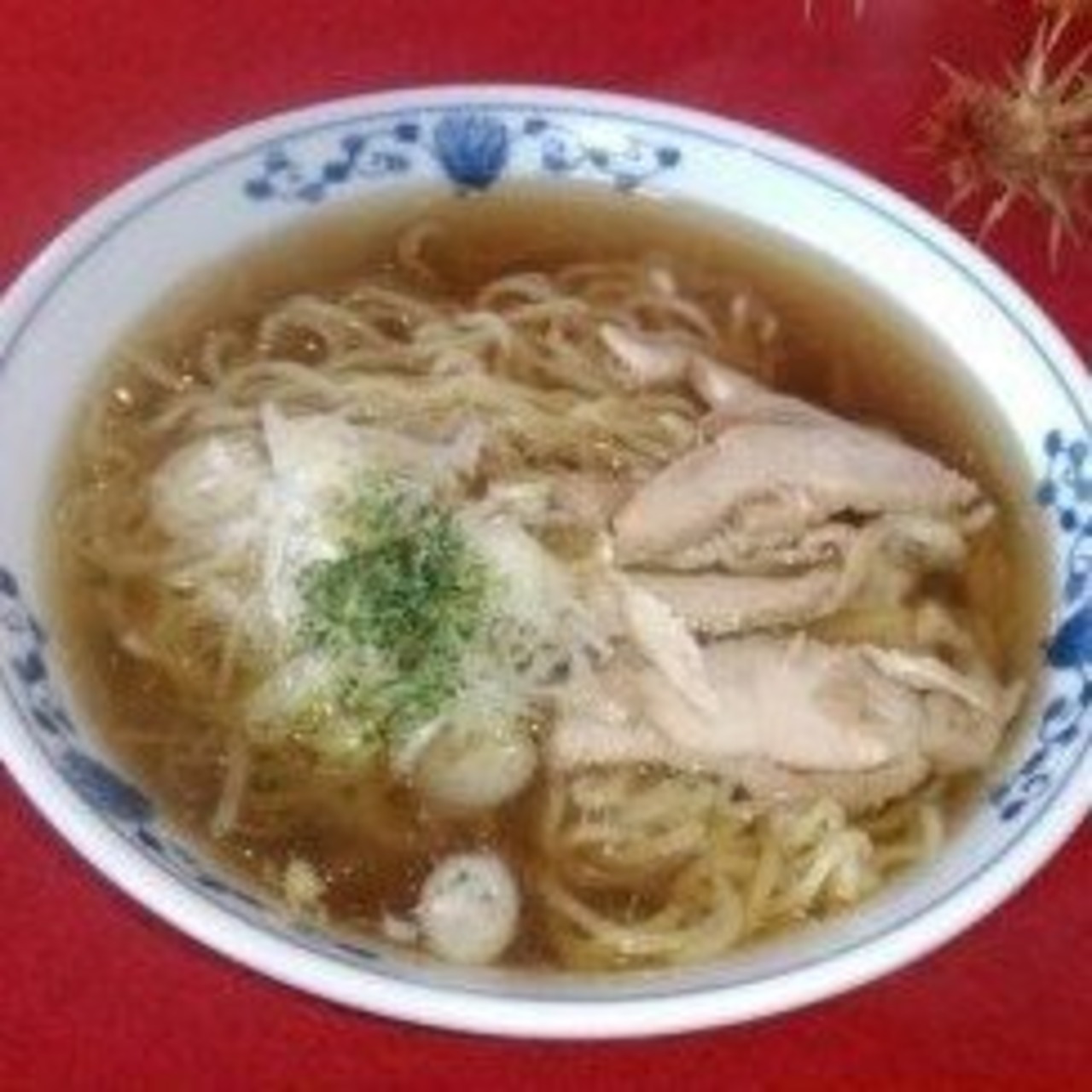 親鶏だしの温かいしょうゆ汁を麺にかけ、親鶏を煮込んだチャーシューとねぎをのせて食べる山形県河北町谷地(やち)まる梅の味『温かい鶏ラーメンです。