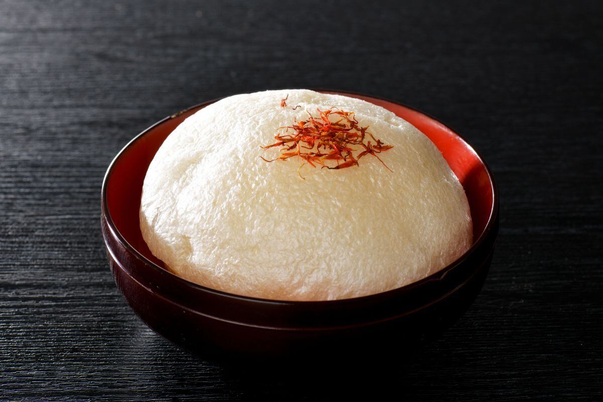 お吸い物やわかめスープ、ラーメンなどの汁物に泡麩をのせ、上から紅花の花びらを散らします。