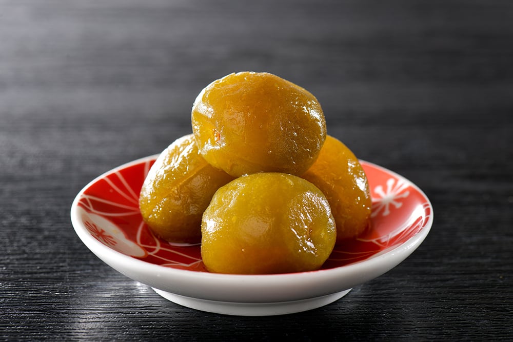 青梅の一つひとつに針で穴をあけ一度冷凍。水を一滴も加えずに砂糖・塩・青梅のエキスのみで作った甘露煮になります。一緒に入っているシロップは、クエン酸がたっぷりで後味スッキリ!水や炭酸水で6~7倍に割って梅ジュースとしてもお召し上がりいただけます。
